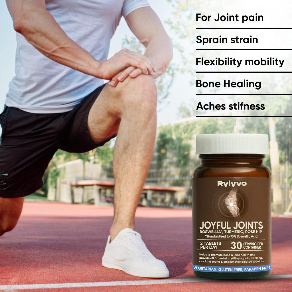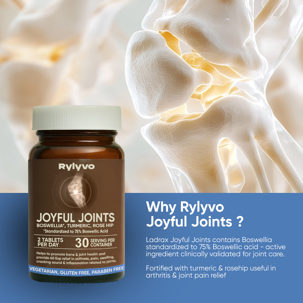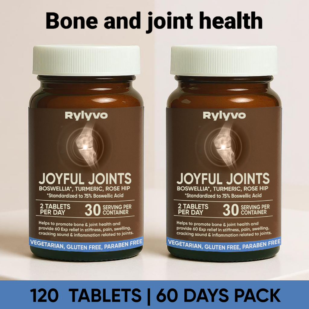 Rylyvo Joyful Joints is a high-absorption, triple-action herbal formula designed to support flexibility and ease joint pain and stiffness. Made with Ashwagandha, Boswellia, Rose Hip, and Curcumin, it helps manage chronic pain, sprains, backaches, sciatica, spondylitis, and inflammation, without the gastric side effects linked to NSAIDs.It’s especially useful for adults over 60 and post-menopausal women, though joint issues aren’t limited by age. Studies show 13.9% of adults over 25 deal with joint pain, and that number jumps to 33.6% after 65, with many suffering from osteoarthritis and joint swelling.If you're looking for tablets for joint pain, knee joint tablets, or a reliable joint support tablet, this blend offers a natural approach. It's also suitable as a bone pain killer tablet or joint pain killer tablet alternative for daily relief. Trusted as one of the best tablets for joint pain and best medicine for knee joint pain, Rylyvo Joyful Joints also supports mobility, making it a solid pick among joint care tablets, joint pain capsules, and tablets for joints and bones that actually work.