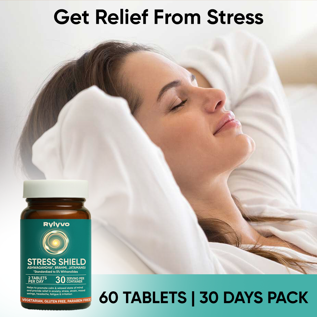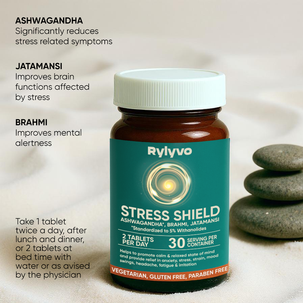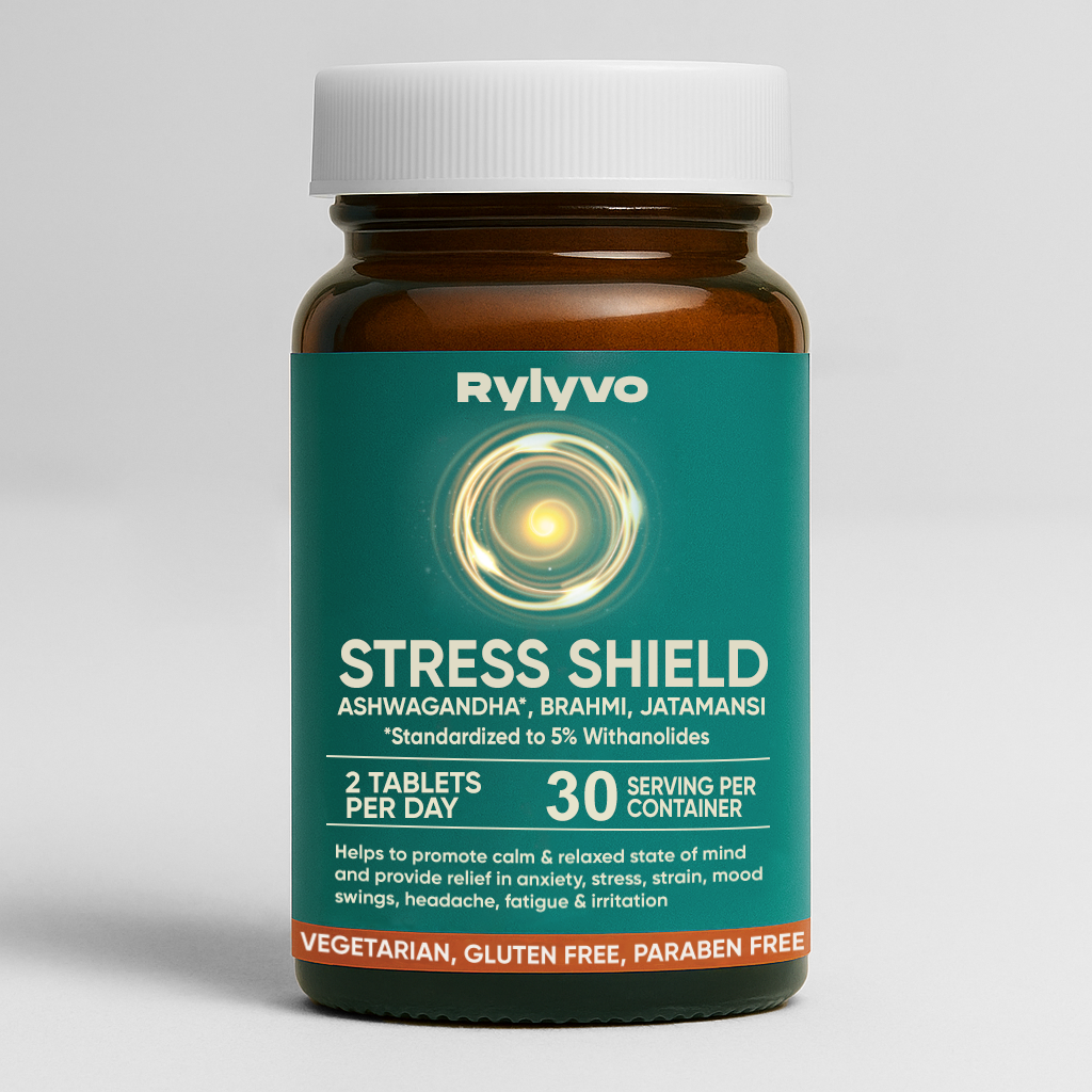 Rylyvo Stress Shield is a clean, plant-based stress relief medicine formulated with Ashwagandha tablets, Brahmi, and Jatamansi—proven herbs for stress and anxiety. Together, they help regulate cortisol, calm the nervous system, and boost resilience to daily pressure.